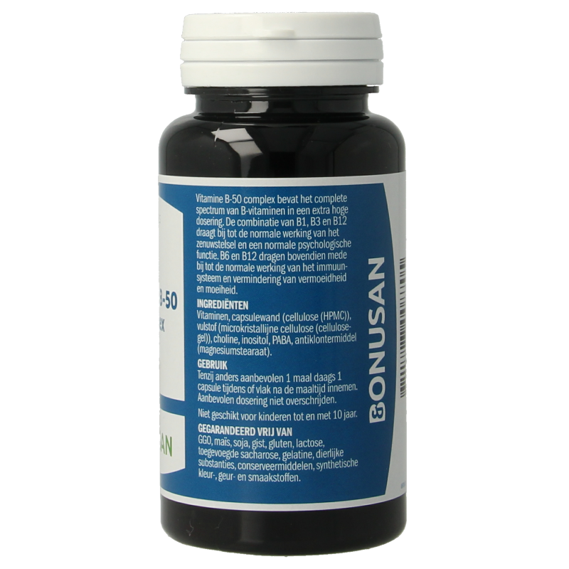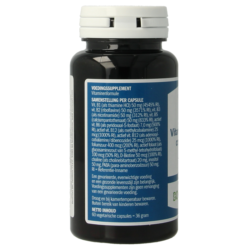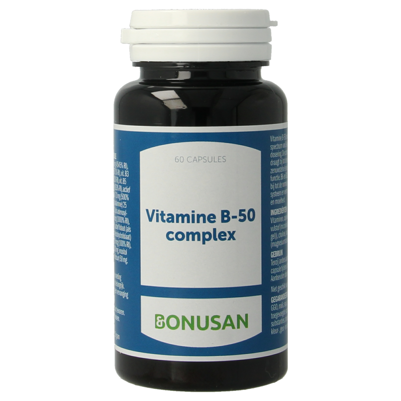 Vitamine B-50 complex bevat het complete spectrum van B-vitaminen. Daarnaast bevat het inositol, PABA en choline.
