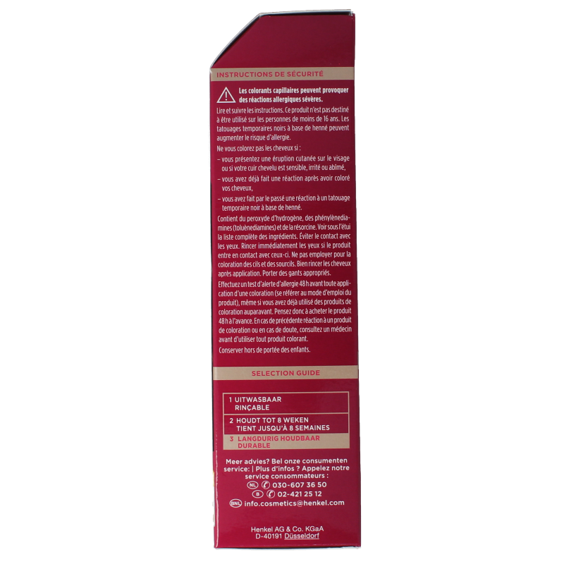 Verdeel het kleurmengsel lokje voor lokje over het droge, niet gewassen haar. Masseer het mengsel goed in. Laat het mengsel 30 minuten inwerken. Voor nuance 200 en 280: Laat het mengsel 30-45 minuten inwerken.