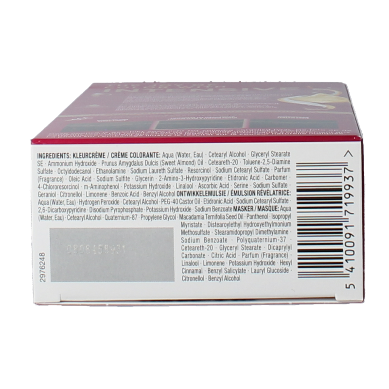 Aqua, Cetearyl alcohol, Ammonium hydroxide, Glyceryl stearate, Prunus amygdalus dulcis oil, Ceteareth-20, Toluene-2,5-Diamine sulfate, Octyldodecanol, Sodium laureth sulfate, Ethanolamine, Resorcinol, Parfum, Sodium cetearyl sulfate, Oleic acid, Sodium sulfite, Potassium stearate, Glycerin, Tetrasodium EDTA, 2-Amino-Hydroxypyridine, Carbomer-4-chlororesorcinol, m-Aminophenol, Potassium hydroxyde, Serine, Ascorbic acid, Sodium sulfate, Linalool, Benzoic acid